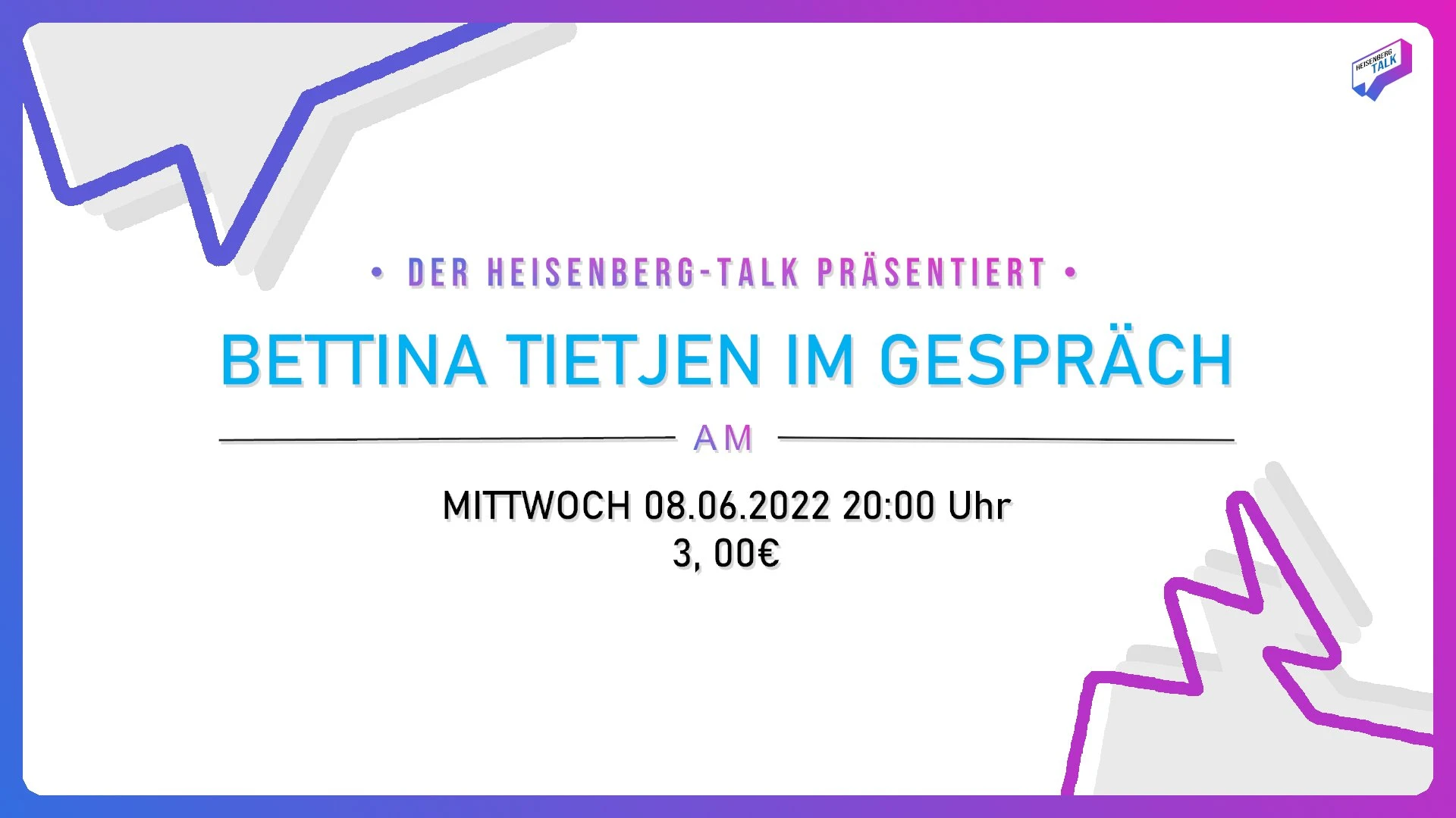 Hey! Es ist soweit! Der nächste Heisenberg-Talk findet am Mittwoch, den 08.06.2022 um 20:00 Uhr in der Pausenhalle statt! Dieses Mal dürfen wir Bettina Tietjen als Gast bei uns begrüßen. Die Karten für den Heisenberg-Talk verkaufen wir ab dem 30.05.2022 auf dem Pausenhof. Gerne können auch Eltern, Freunde oder andere Personen außerhalb des Heisenberg-Gymnasiums zum Talk kommen. Zusätzlich wird es einen Getränke- und Snackverkauf beim Talk geben.