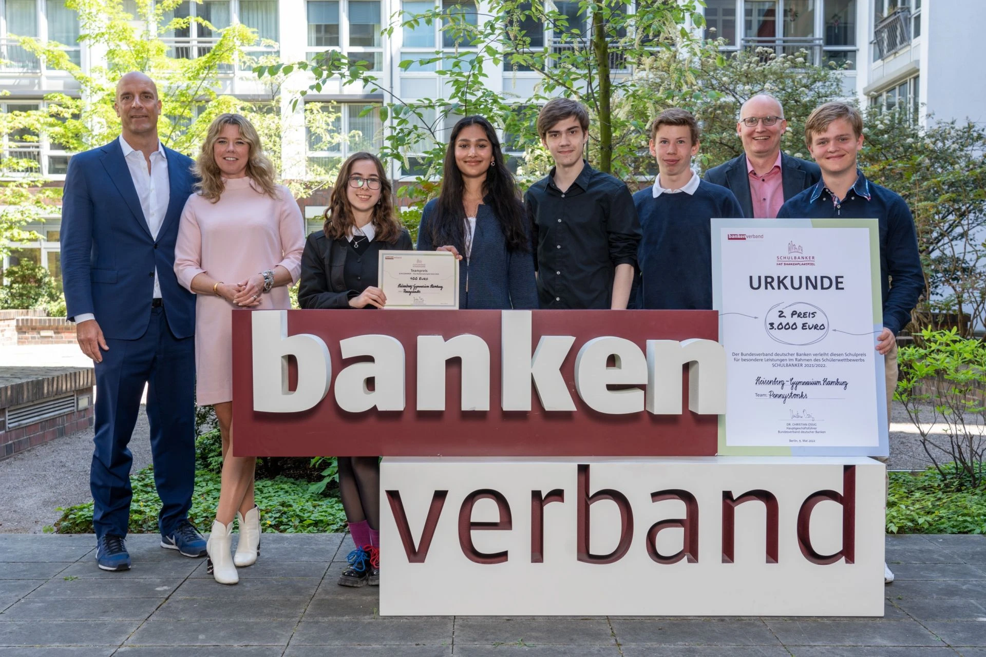 Das Team Pennystonks mit Leo Riebesell, Sukhmani Voigt, Simon Sills, Nicole Kaimov und Nico Owczarzewicz aus dem Nachhaltigkeitsprofil (PGW – Bio – Wirtschaft) in S2 hat unter der Betreuung von Herrn Malitius beim Bundeswettbewerb „Schulbanker“ im Finale der 20 besten Schülerbanken aus dem deutschsprachigen Raum den zweiten Platz erreicht. Dieser ist mit einem Schulpreisgeld in Höhe von 3.000 Euro und einem persönlichen Bonus von 400 Euro für die Schüler dotiert.