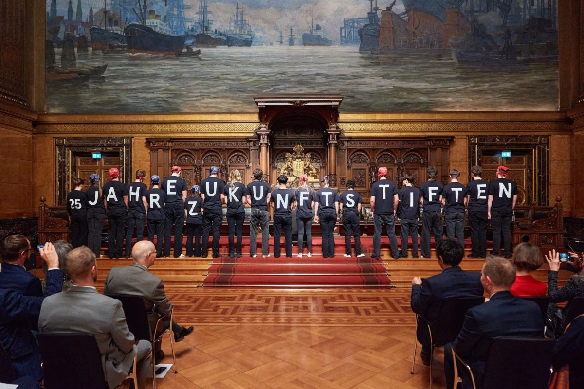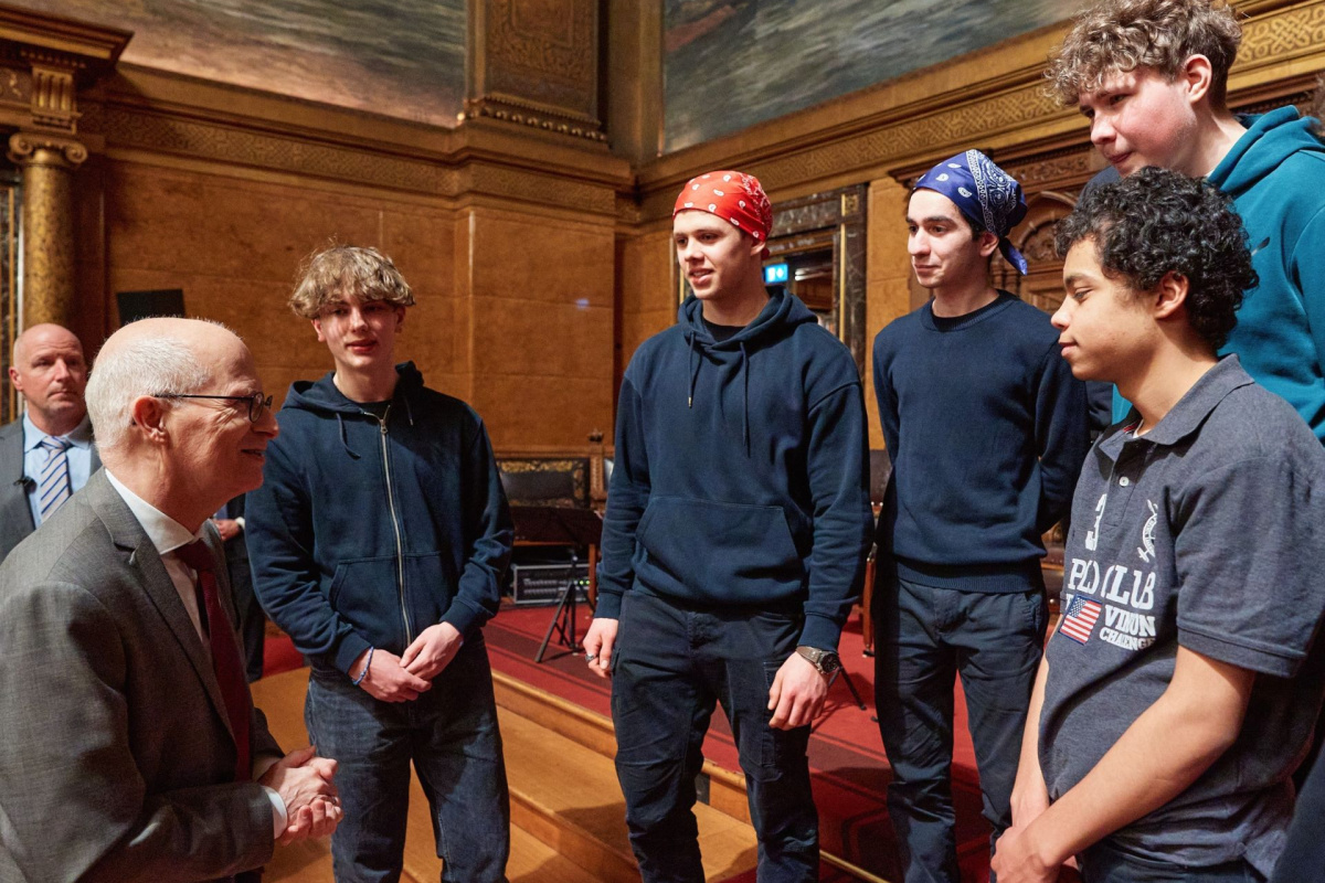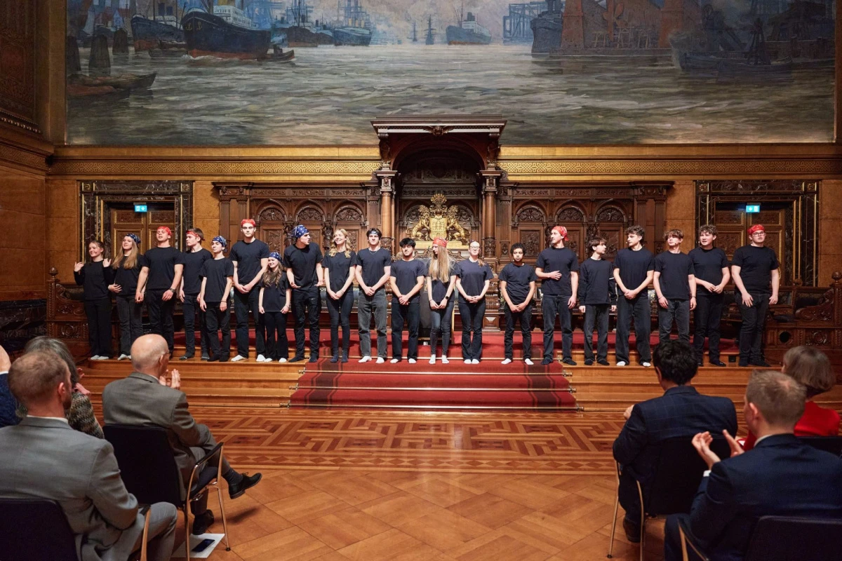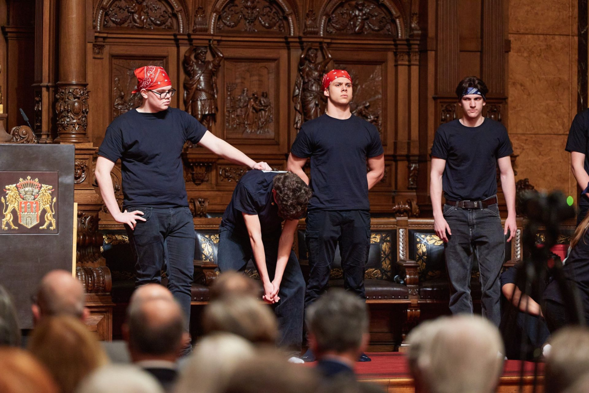 Im Rahmen unserer tusch-Partnerschaft mit dem Deutschen Schauspielhaus wurde unser Theaterkurs Jahrgang 11 unter der Leitung von Kai Springer eingeladen, anlässlich der Feier zum 25-jährigen Bestehen der BürgerStiftung Hamburg am 8. Februar im Großen Festsaal des Hamburger Rathauses eine Szene aufzuführen.