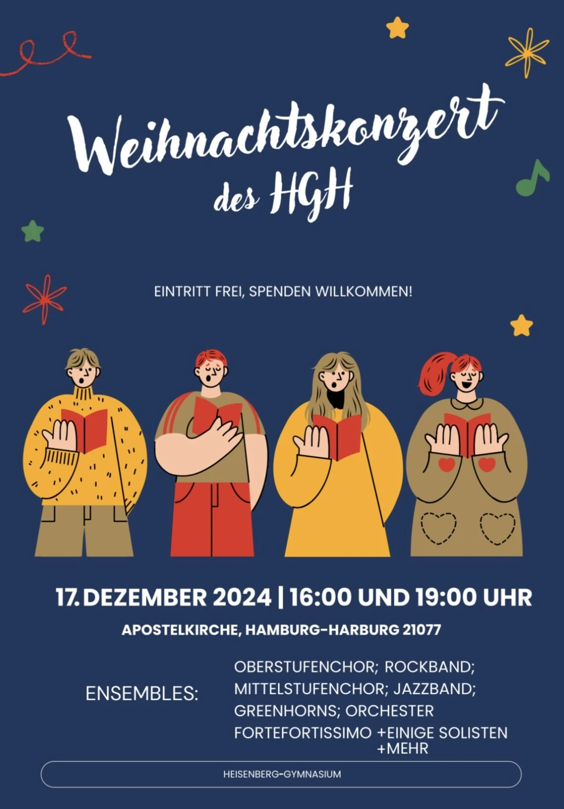 Juhuu, es ist wieder so weit!Wir laden alle Schülerinnen und Schüler, Kolleginnen und Kollegen, Eltern, Ehemalige und Freunde des Heisenberg-Gymnasiums herzlich zu unseren diesjährigen Weihnachtskonzerten am 17.12.2024 um 16:00 Uhr und um 19:00 Uhr in die Apostelkirche in Harburg ein.