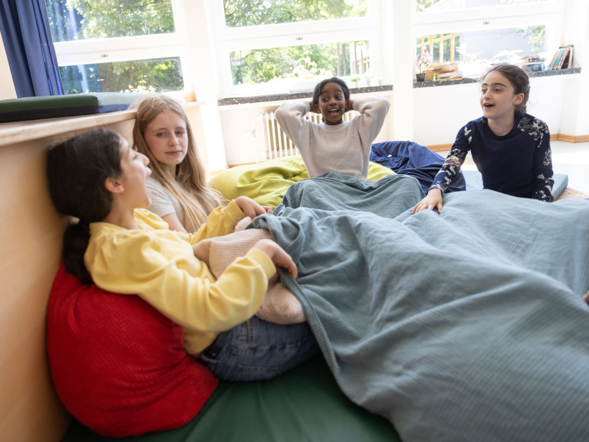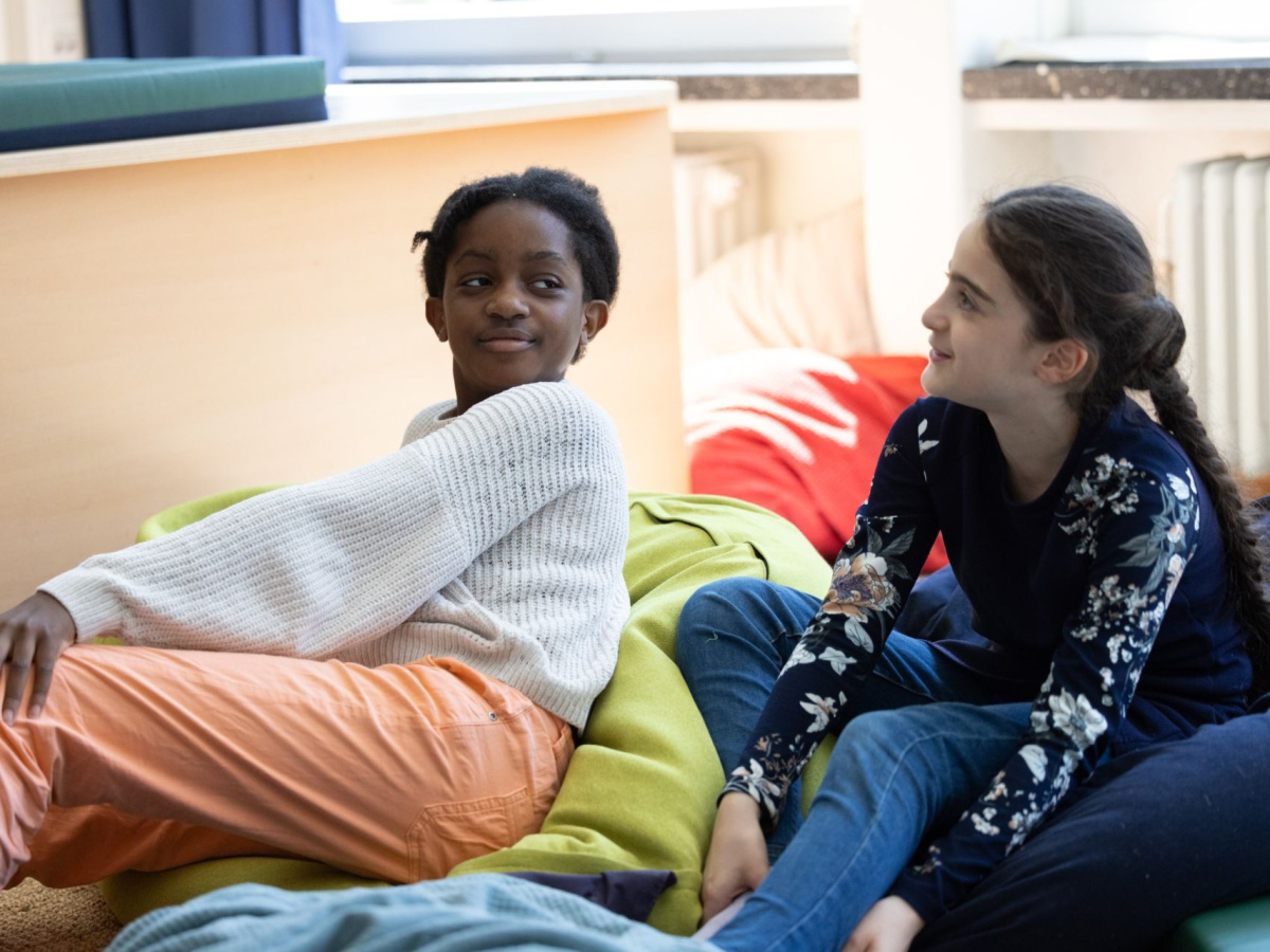 13:30 Uhr am Nachmittag, der Unterricht ist vorüber. Jetzt geht es in meinen Anmelderaum in einer von drei Gruppen. Schnell den Ranzen in die Ecke und dann erstmal zum Essen in die Mensa. Meine Freundin geht zur Lernzeit und hat schon in der zweiten großen Pause gegessen. Bei der Lernzeit bekommt sie Hilfe bei den Hausaufgaben und kann Fragen stellen zu Themen, die sie nicht verstanden hat. Ich mache meine Hausaufgaben lieber zu Hause, deshalb gehe ich erstmal in die Bücherei oder tobe draußen am Reck. Gegen halb drei gehen wir zur 6K-United!-AG. Letztes Halbjahr war ich in der Informatik-AG, dort haben wir mit dem 3-D-Drucker einen Tischtennisschläger repariert. Anton geht immer sehr gerne in die Spiele-AG und baut an der neuen Gravitrax-Bahn mit. Andere aus meiner Klasse legen sich nicht so gerne fest und spielen je nach Wetter draußen Fußball oder lassen sich von jemandem aus dem GTS-Team ein neues Spiel erklären. Wenn wir kein Programm haben und es draußen richtig schmuddelig ist, verkriechen wir uns am liebsten in den Chillraum. Da darf man nur auf Socken rein und kann sich mit Matratzen eine gemütliche Sitzecke bauen.