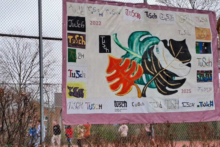 Zum Jahreswechsel 2025 gestalteten die Schülerinnen Ela-Su Gülbol, Alessia Meyn, Teresa dos Santos, Talea Stodt und Stina Trepoll aus dem Jahrgang 6 ein drittes TUSCH-Blatt für das Großposter auf dem Schulhof, das wieder in der Begabungsförderung Bildende Kunst entstand.